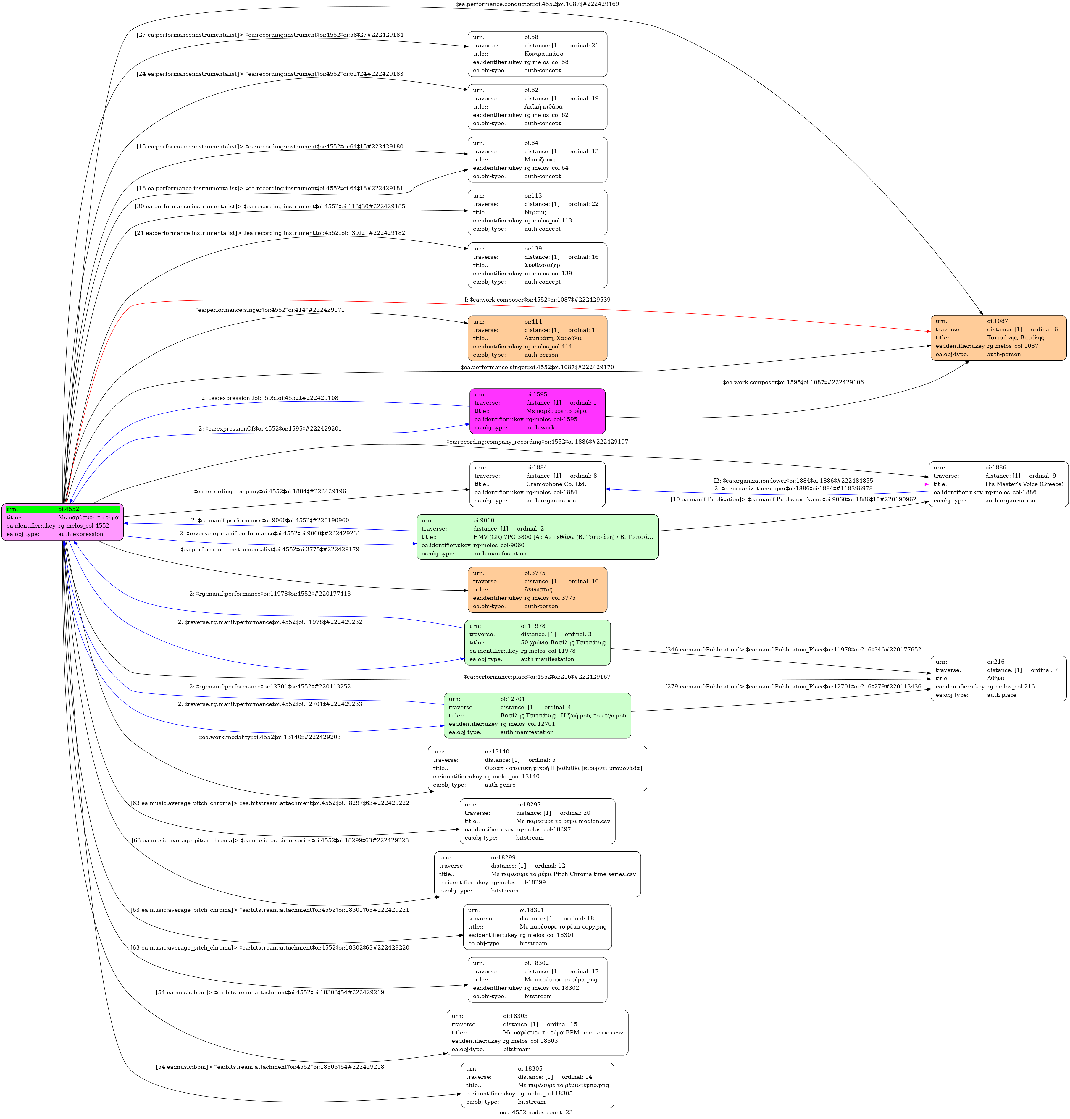 - Το ραβδόγραμμα δείχνει τις χρονο-μεσοσταθμικές τιμές του chromagram, κανονικοποιημένες στη μονάδα. Τα αρχεία CSV περιέχουν τα αριθμητικά δεδομένα που χρησιμοποιήθηκαν για τη δημιουργία του ραβδογράμματος και του chromagram. Οι κορυφές (μέγιστα) του chromagram και των ραβδογραμμάτων αντιστοιχούν στις πιο έντονες νότες που παίζονται ή τραγουδιούνται. Στις περισσότερες περιπτώσεις, η μέγιστη κορυφή στο ραβδόγραμμα αντιστοιχεί στην τονική του πιο κυρίαρχου δρόμου. Σε άλλες περιπτώσεις, μπορεί επίσης να αντιστοιχεί στην πέμπτη και, λιγότερο συχνά, στην τρίτη του δρόμου (ή δρόμων). Σημειώστε επίσης ότι, λόγω της εναρμόνισης των δρόμων, το chromagram και το ραβδόγραμμα μπορεί να παρουσιάζουν κορυφές (τοπικά μέγιστα) στη δεύτερη και (φυσική) έβδομη βαθμίδα τους.